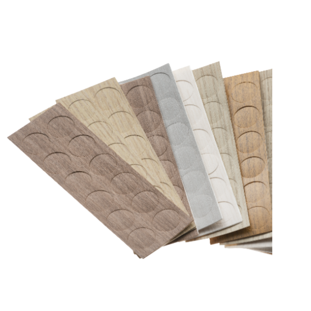 Fabricados a partir de fitas de borda disponíveis no mercado nacional, estes tapa-furos possuem cores e texturas iguais às chapas de melamina distribuídas no mercado brasileiro e podem ser fabricados em qualquer diâmetro. As principais medidas trabalhadas pela BFK são 12, 13, 15, 17, 18, 19 e 21mm.